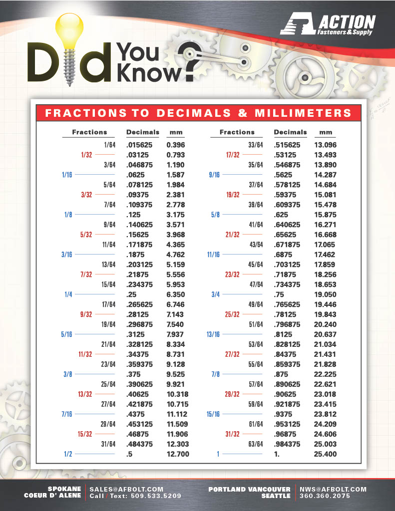 FRACTIONS TO DECIMALS MILLIMETER CHART